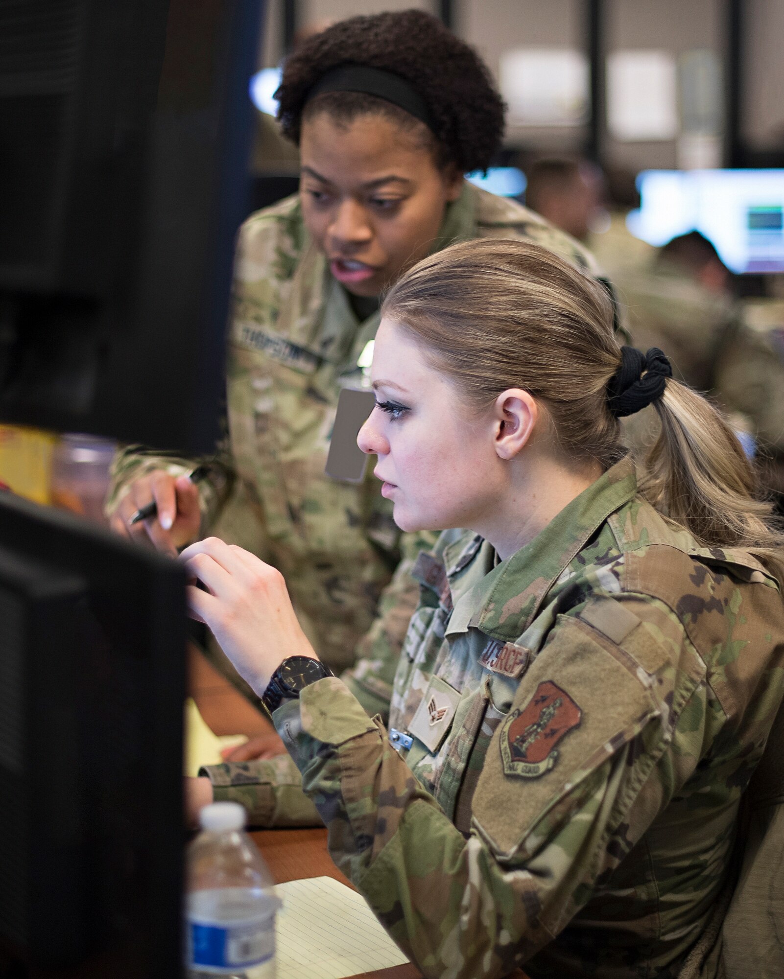 U.S. Space Force 1st Lt. Laura Drapinski, 2d Space Warning Squadron, front, and Spc. 4 Ariana Gonzalez, 11th Space Warning Squadron, back, use a Space-Based Infrared System Simulator to monitor missile indications during simulated combat operations in United States European Command during SPACE FLAG 23-1 at Schriever Space Force Base, Colorado, Dec. 13, 2022. SPACE FLAG 23-1 ran from Dec. 5-16 and was the third Coalition SPACE FLAG and the 16th iteration of the SPACE FLAG exercise series. 23-1 was the first in the SPACE FLAG program to exercise combat tactics in a USEUCOM scenario. (U.S. Space Force photo by Judi Tomich)