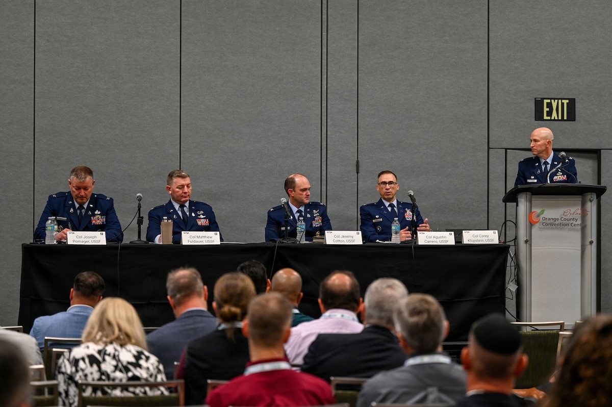 Chief Master Sgt. Karmann-Monique Pogue, command senior enlisted leader for Space Training and Readiness Command, moderates the Joint Senior Enlisted Leader Panel during the Interservice/Industry Training, Simulation and Education Conference in Orlando, Fla., Dec. 2, 2025. Seated left to right are Master Sgt. David Elliott, U.S. Army; Master Chief Petty Officer Monte Ellis, U.S. Navy; Sergeant Major Charles “Chuck” Houston, U.S. Army; Master Sgt. Justin M. Creger, U.S. Space Force; and Chief Master Sgt. Chloe L. Rainey-Fluellen, U.S. Air Force. The panel focused on enlisted perspectives on training culture, readiness priorities and strengthening joint force proficiency. (U.S. Space Force photo by Brandon Kalloo Sanes)