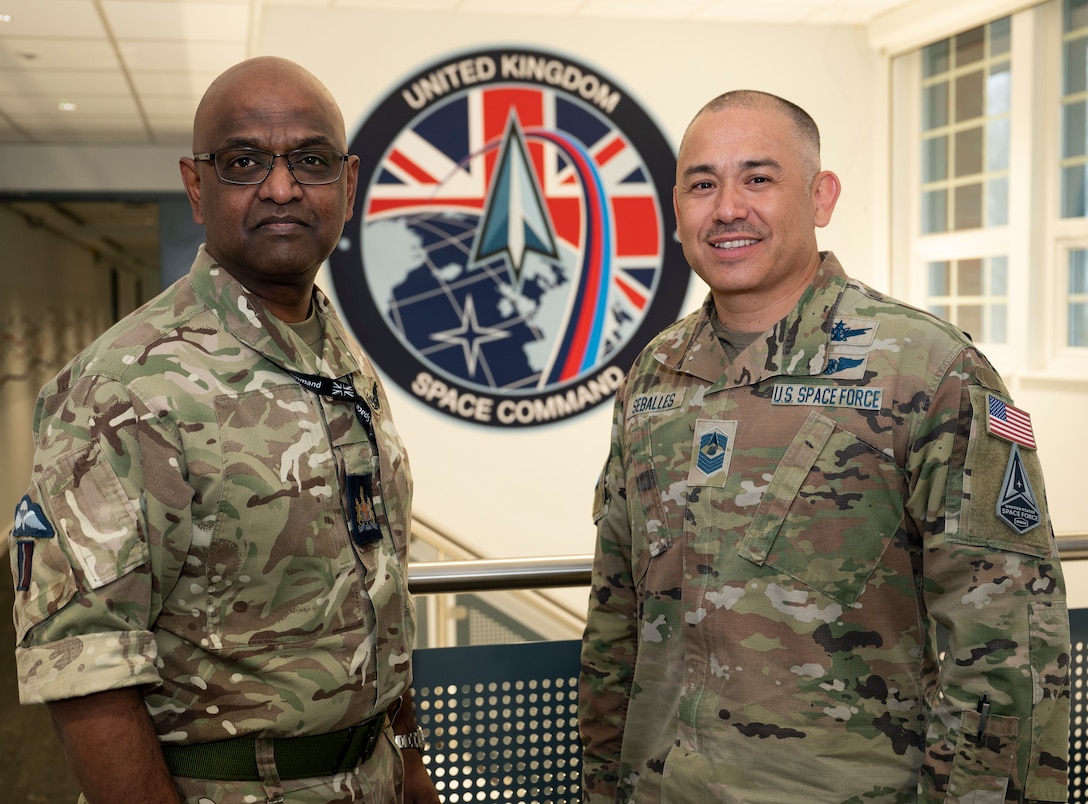 Chief Master Sgt. James Seballes, senior enlisted leader of Space Training and Readiness Command, right, and Warrant Officer Subby Subramaniam, command warrant officer of U.K. Space Command, left, pose for a photo during a visit to Headquarters, U.K. Space Command at RAF High Wycombe, England, Jan. 25, 2023. The two sides discussed activities such as future coalition exercises, increased personnel exchanges, and enhanced education and training opportunities, which represent some of the most straightforward means to strengthen cooperation and support shared objectives. (U.S. Air Force photo by 1st Lt. Charles Rivezzo)