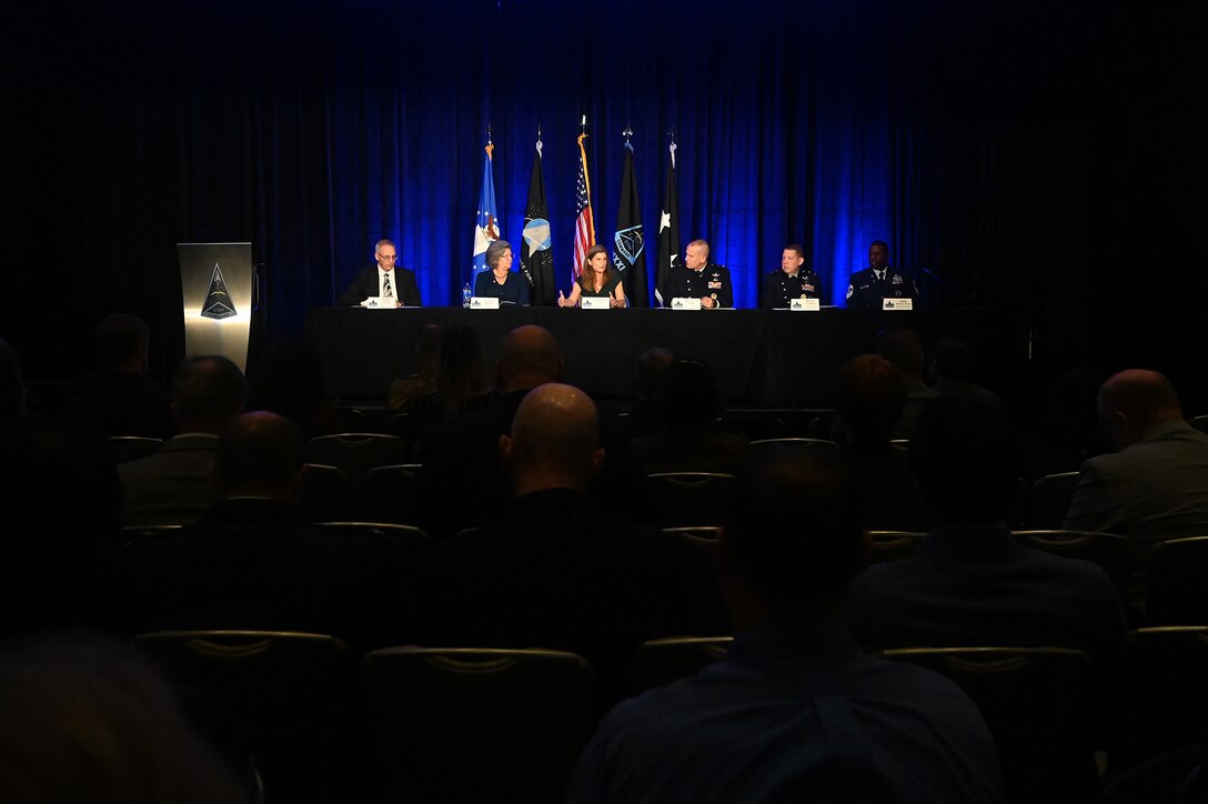 Panel members including U.S. Space Force Maj. Gen. Timothy Sejba, center right, Commander of Space Training and Readiness Command, and Ms. Katharine Kelley, center left, Deputy Chief of Space Operations for Human Capital, take part in a discussion at the Space Training and Readiness Command Partnership Days event in Reston, Va., Oct. 31, 2024. The gathering welcomed industry and academia participation and provided opportunities for organizations to present concepts on training that could benefit the future of the Space Force. (U.S. Air Force photo by Andy Morataya)
