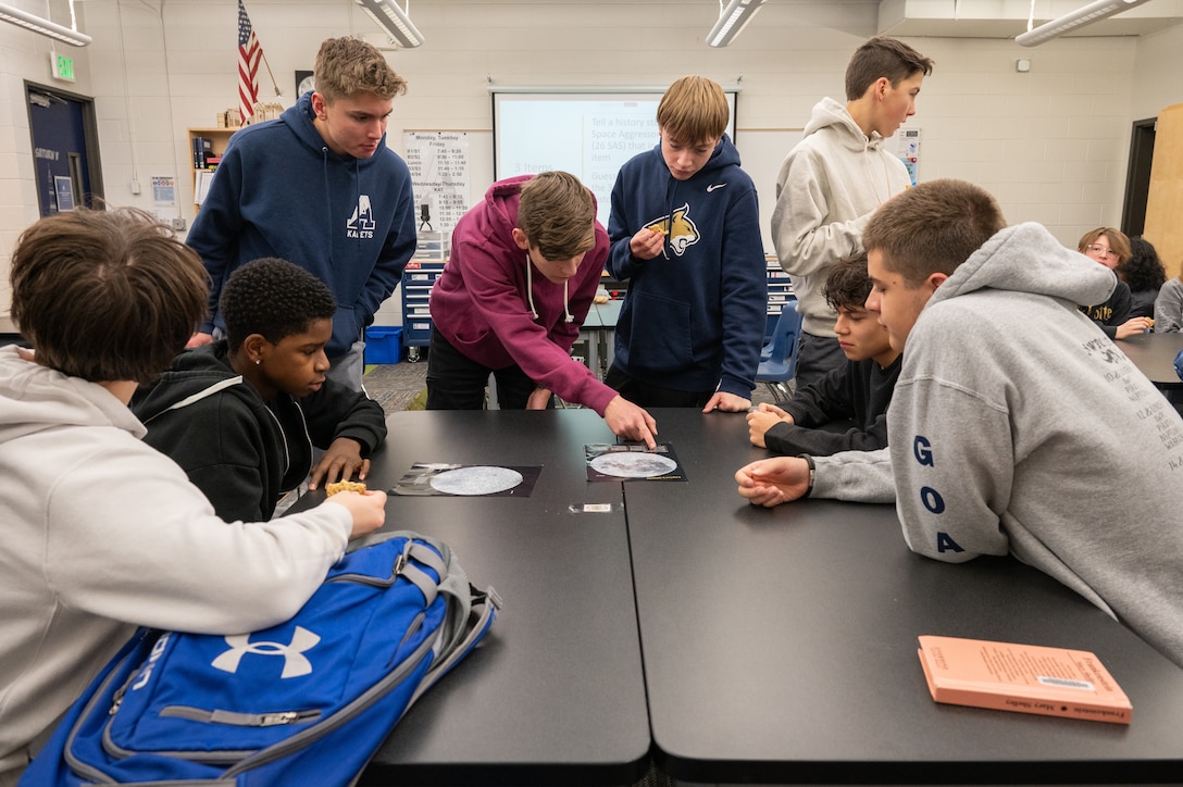 Students in the Introduction to Aviation and Aerospace class analyze an object related to 26th Space Aggressor Squadron (SAS) history at Air Academy High School, Colorado, Jan. 14, 2025. The 310th Space Wing facilitated presentations and activities for the students during a community outreach event focused on 26th SAS history and current mission. The event is part of the Wing’s "Year of Heritage" initiative to educate the community on the history and contributions of the Wing. (U.S. Air Force photo by Tech. Sgt. Marko Salopek)