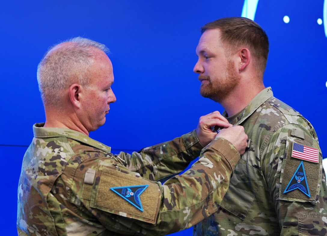 U.S. Space Force Col. Bryan Dutcher, Delta 13 commander, left, pins Tech. Sgt. Robert Camlin, assigned to the Vosler Academy, right, with the Air and Space Achievement Medal during a recognition ceremony at Peterson Space Force Base, Colorado, May 1, 2025. The award was presented to Camlin and two other Guardians from the Vosler Academy for their quick actions to render aid to a crash victim and assist the Colorado Springs Police Department during a vehicle accident on April 16, 2025.