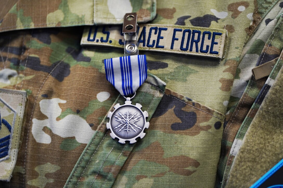 U.S. Space Force Master Sgt. Jessica Morgan, assigned to the Vosler Academy, is awarded the Air and Space Achievement Medal during a recognition ceremony at Peterson Space Force Base, Colorado, May 1, 2025. Morgan and two other Guardians assigned to Vosler were awarded the medal for rendering aid to a crash victim and assisting Colorado Springs Police Department officers during a vehicle accident on April 16, 2025. (U.S. Space Force photo by Isaac Blancas)